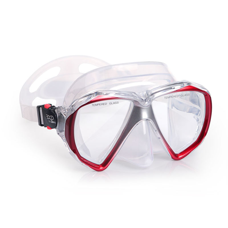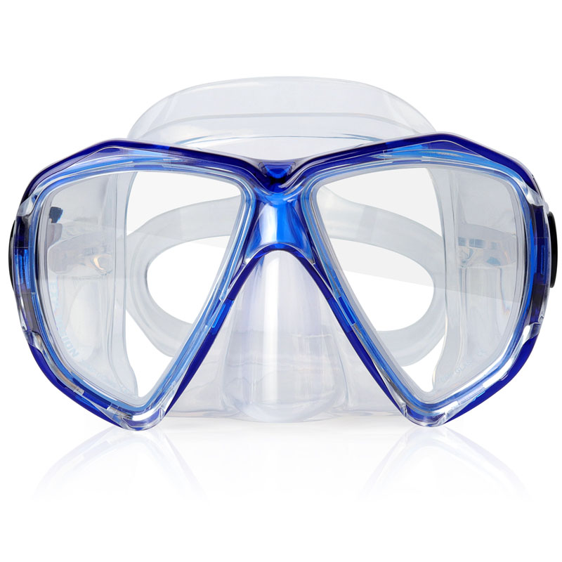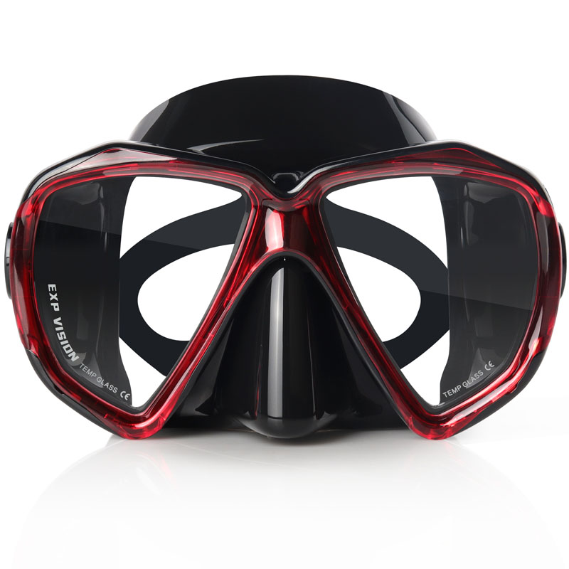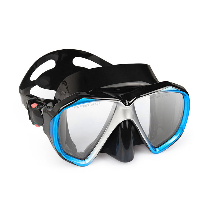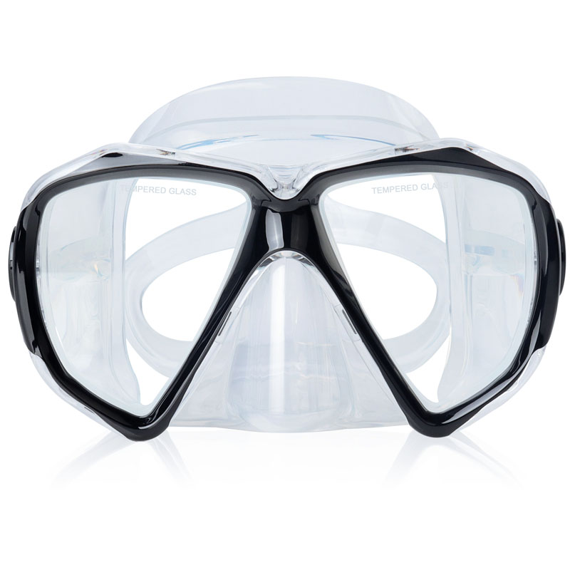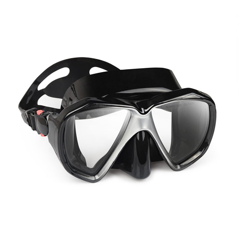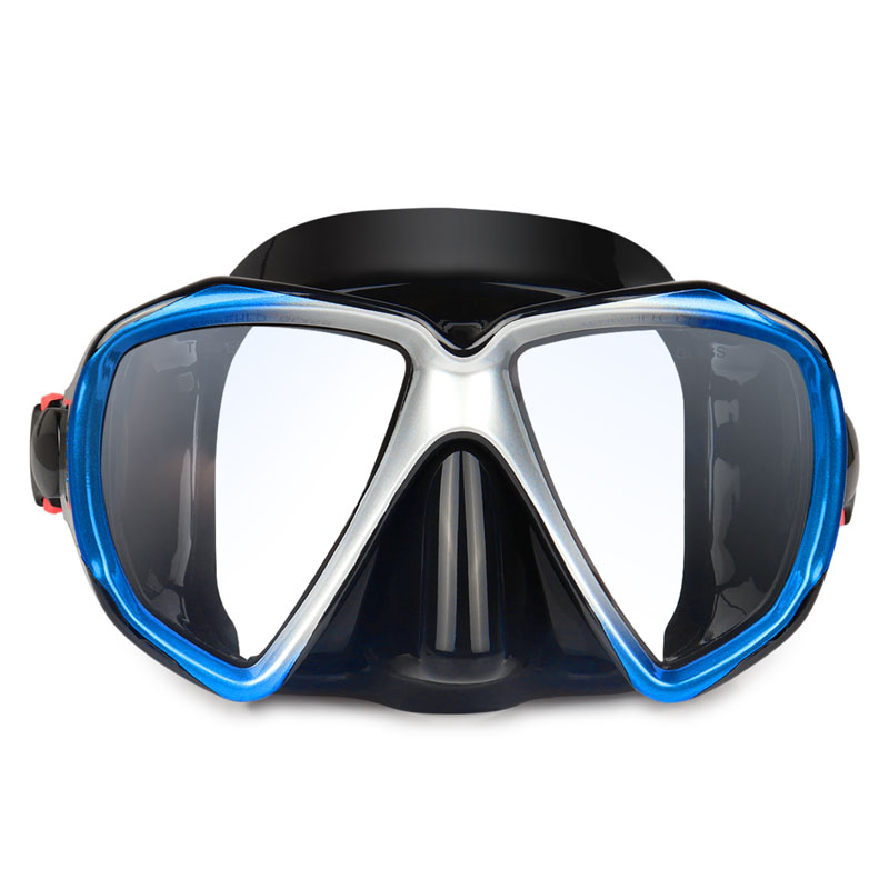 두 개의 렌즈가있는 강화 안경 스쿠버 다이빙 마스크입니다. 30 미터 이상의 물에서 사용할 수 있습니다.